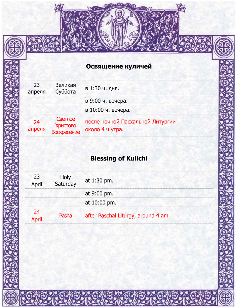 - По воскресным дням, часы в 9:45, Божественная Литургия в 10:00