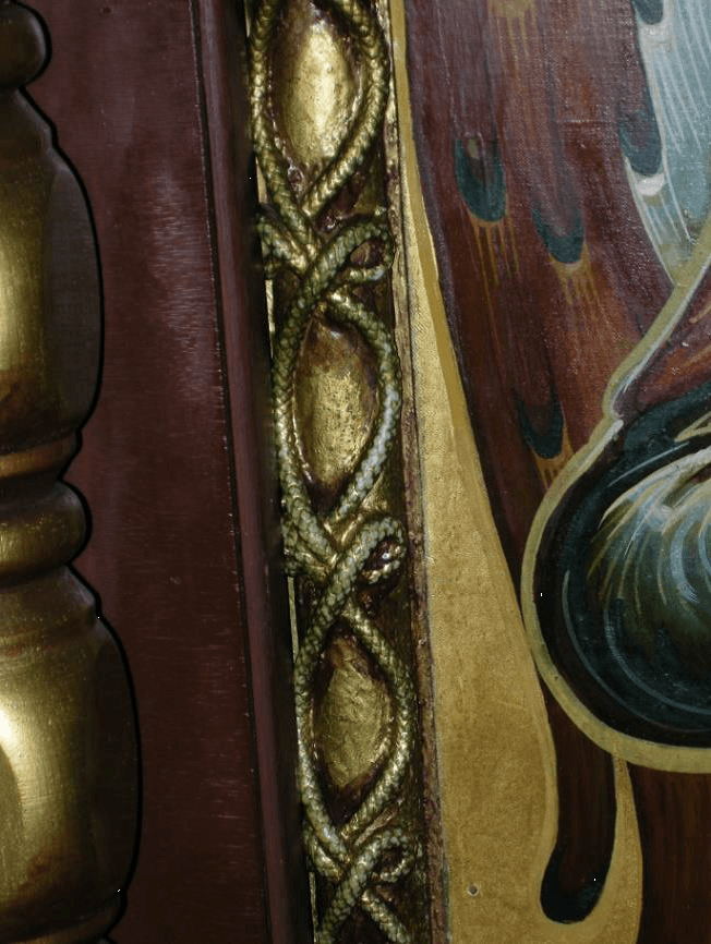 О.Георгий нашёл очень остроумный и красивый способ украсить иконостас: вместо трудоёмкой и дорогой резьбы по дереву о.Георгий использовал тонкий канат.